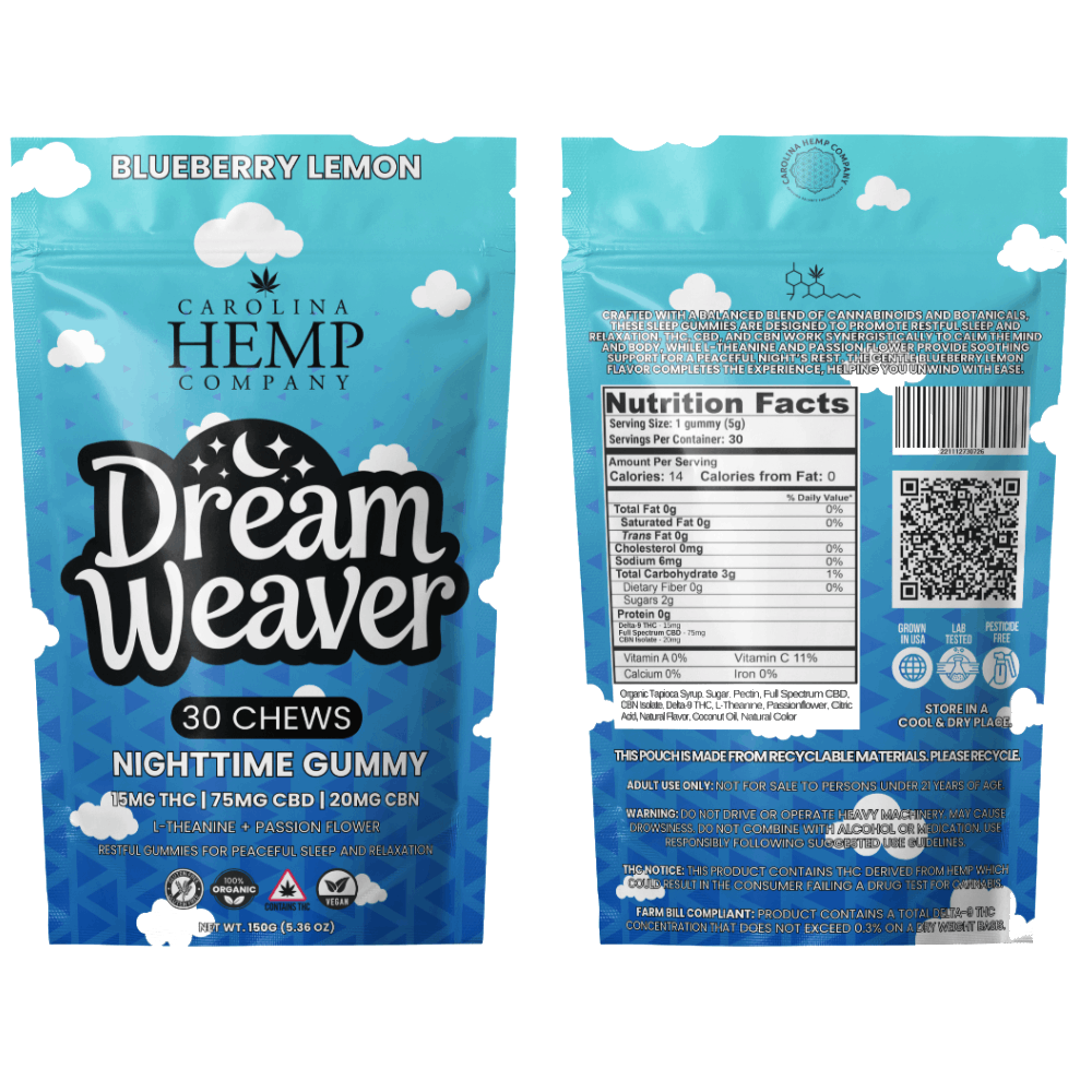 Ease into restful sleep with our Dream Weaver Gummies, a carefully balanced nighttime formula designed to help you drift off naturally. Each gummy combines 15 mg Delta-9 THC, 75 mg CBD, and 20 mg CBN, working in harmony to calm the body and quiet the mind.